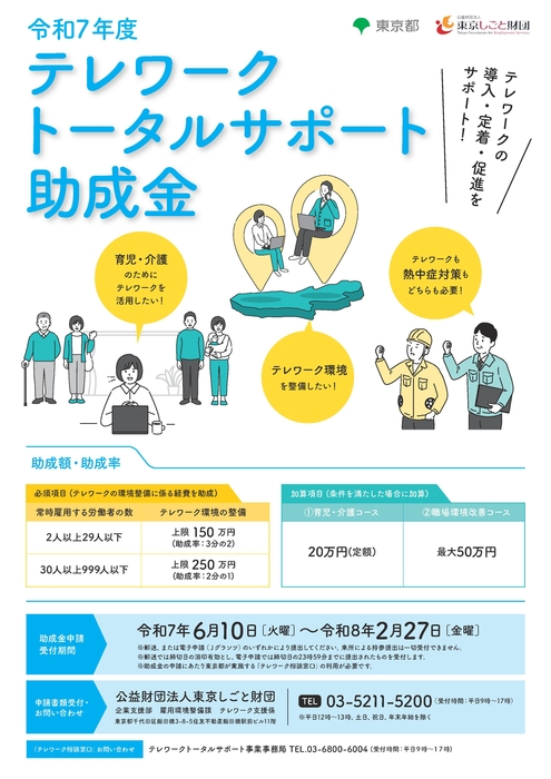 令和7年度テレワークトータルサポート助成金【東京都/公益財団法人東京しごと財団】令和7年度テレワークトータルサポート助成金【東京都/公益財団法人東京しごと財団】国際事務機株式会社では、企業のテレワーク導入・推進を支援する「テレワークトータルサポート助成金」の情報を掲載しています。東京都が実施するテレワーク相談窓口やコンサルティングを利用した都内中堅・中小企業等に対し、テレワーク機器導入経費等のテレワーク環境整備に係る経費を助成します。また、テレワーク環境整備とあわせて改正育児・介護休業法への対応や、テレワーク困難な業務(※)従事者の熱中症対策として、体温を下げるための機能のある作業服や熱中症のリスクを回避する機能のある製品等の整備に係る取組を行った企業等には加算して助成します。 ※(例)建設業、運送業等の現場業務主な対象経費:在宅勤務、モバイル勤務等を可能とする情報通信機器等の導入に係る経費2025年6月10日から2026年2月27日まで申請期間となります。※上記期間内であっても、予算がなくなり次第、受付を終了します。◆助成金額常時雇用者数2人以上29人以下 助成上限150万円(助成率3分の2)+加算項目 最大50万円【職場環境改善コース】※または 30人以上999人以下 助成上限250万円(助成率2分の1)+加算項目 最大50万円【職場環境改善コース】※加算項目のみの申請はできません。◆対象者常時雇用する労働者が2人以上999人以下で、都内に本社または事業所を置く中堅・中小企業等であること申請には「テレワーク相談窓口」の利用が必須となります。詳細は下記リンク&URLよりご確認下さい。【募集要項】公益財団法人東京しごと財団公式ページhttps://www.koyokankyo.shigotozaidan.or.jp/jigyo/telework/teletotal/boshu/07_total.html※下記カタログ画像をクリックするとチラシが閲覧できますテレワークトータルサポート ご相談はこちらからTEL.03-3678-5931お電話の場合は、助成金のページを見てとお伝えいただくとスムーズです。